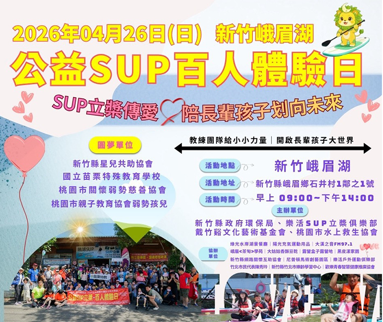 由新竹縣政府環保局、樂活 SUP立槳俱樂部、戴竹谿文化藝術基金會、桃園市水上救生協會等單位主辦的「2026公益 SUP 百人體驗日」,4月26日將在新竹峨眉湖登場,邀請新竹縣星兒共助協會、苗栗特殊教育學校、桃園市關懷弱勢慈善協會、桃園縣親子教育協會等團體,透過水上運動與環境教育,身障孩童參與戶外活動並建立自信。