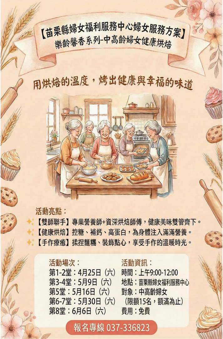 苗栗婦女福利服務中心「樂齡馨香系列-中高齡婦女健康 烘焙課程」免費招生中